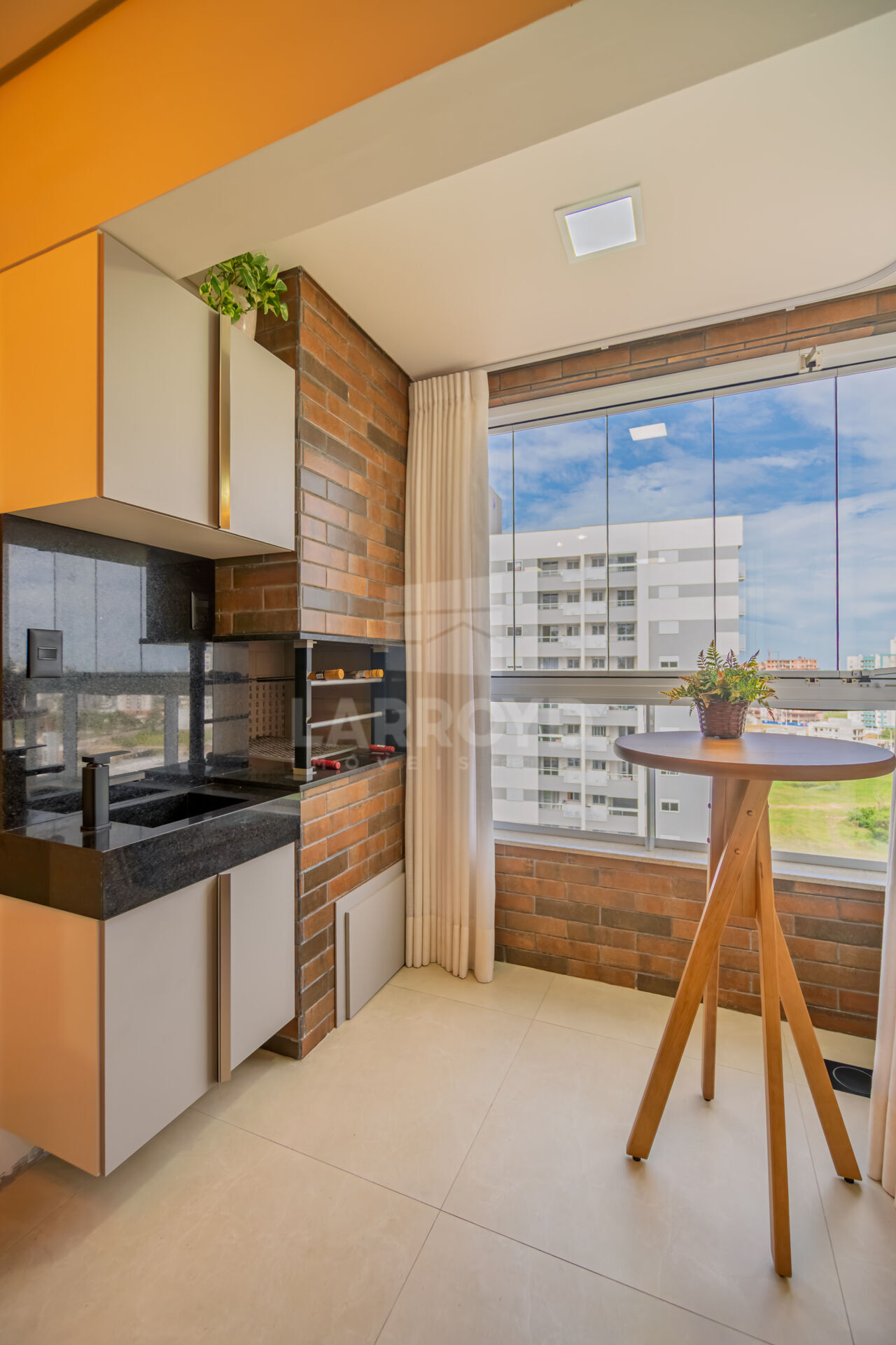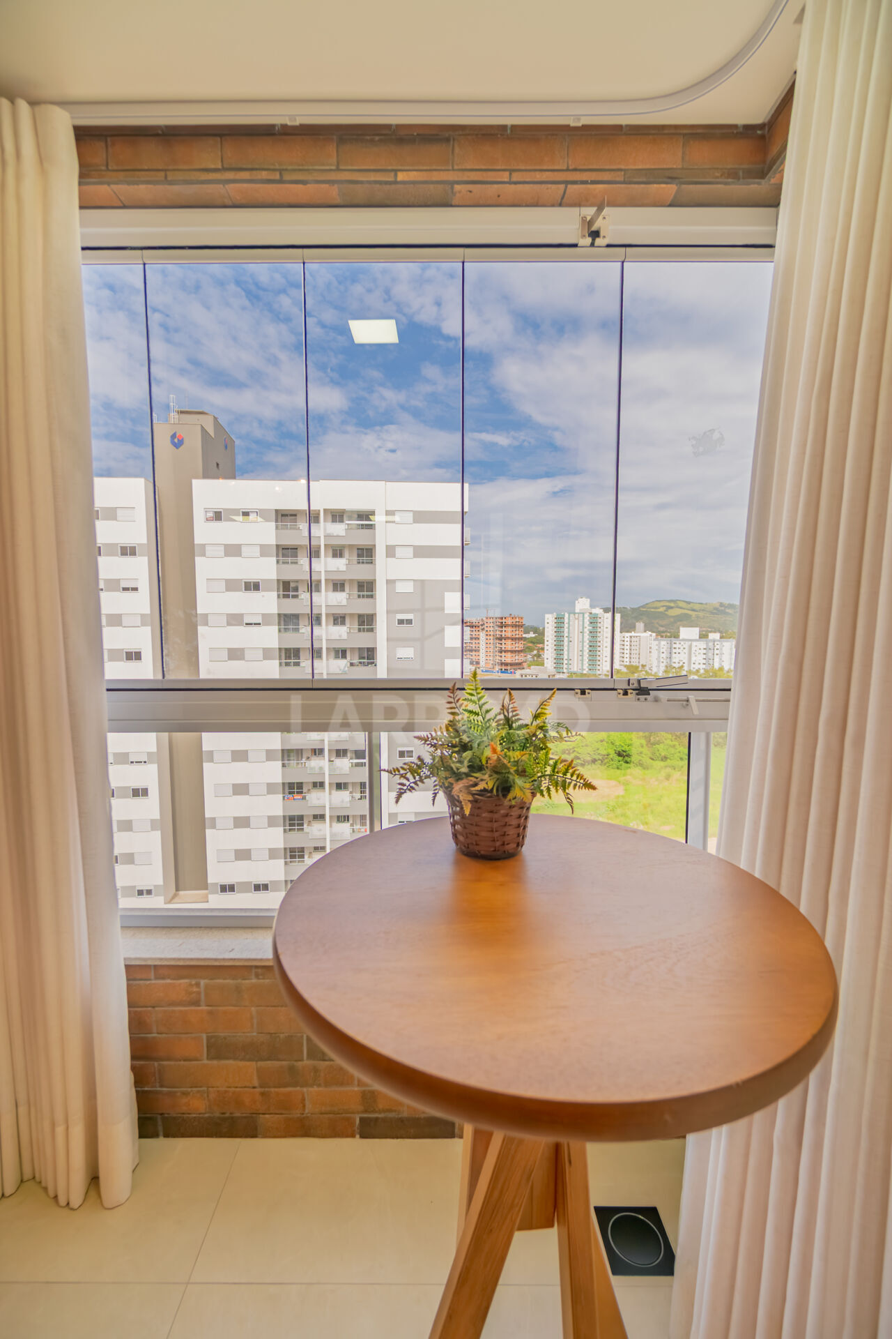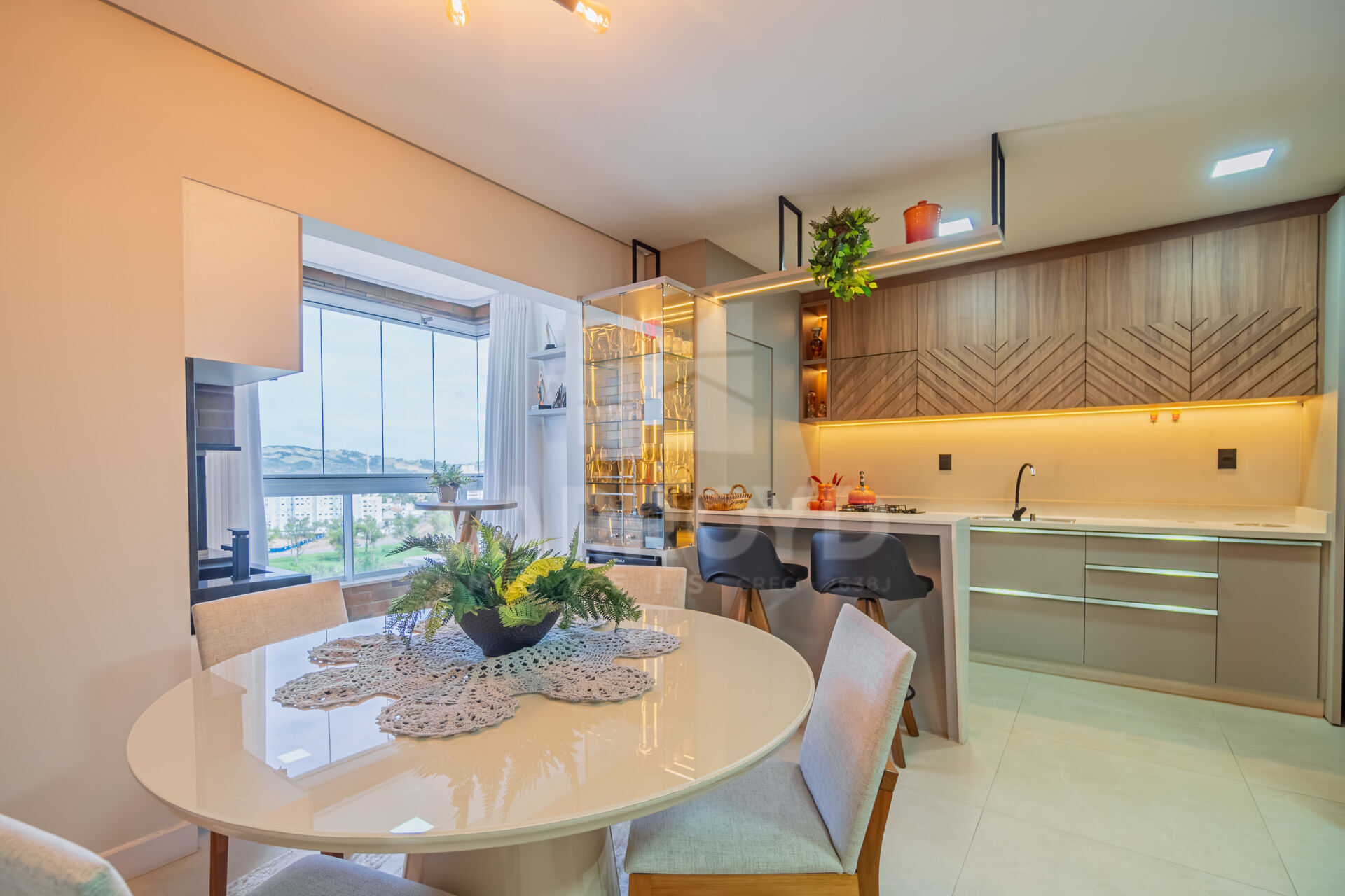 No Edifício Coliseum, este apartamento semi-mobiliado entrega uma rotina prática com área social integrada, marcenaria planejada e bancada para refeições rápidas. A vista aberta aparece nas janelas amplas, trazendo luz natural para o dia a dia.