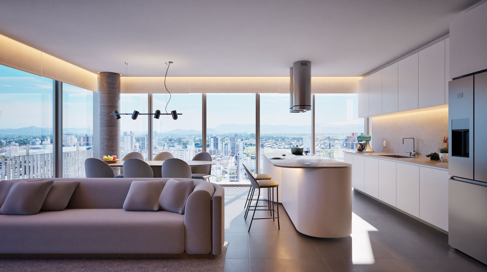 No Fides Residence, este apartamento em construção foi pensado para quem quer morar com rotina prática e um living panorâmico de ponta a ponta, com grandes esquadrias e vista aberta para a cidade. A planta favorece um espaço social contínuo, ideal para receber com conforto.