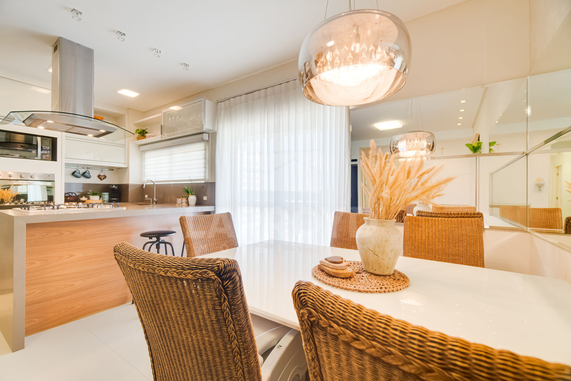 A sala de jantar ganha presença com espelho amplo e pendente sobre a mesa, criando um ambiente agradável para receber. Um dos ambientes já está montado como escritório, ideal para quem trabalha em casa com mais foco, sem invadir a área social.