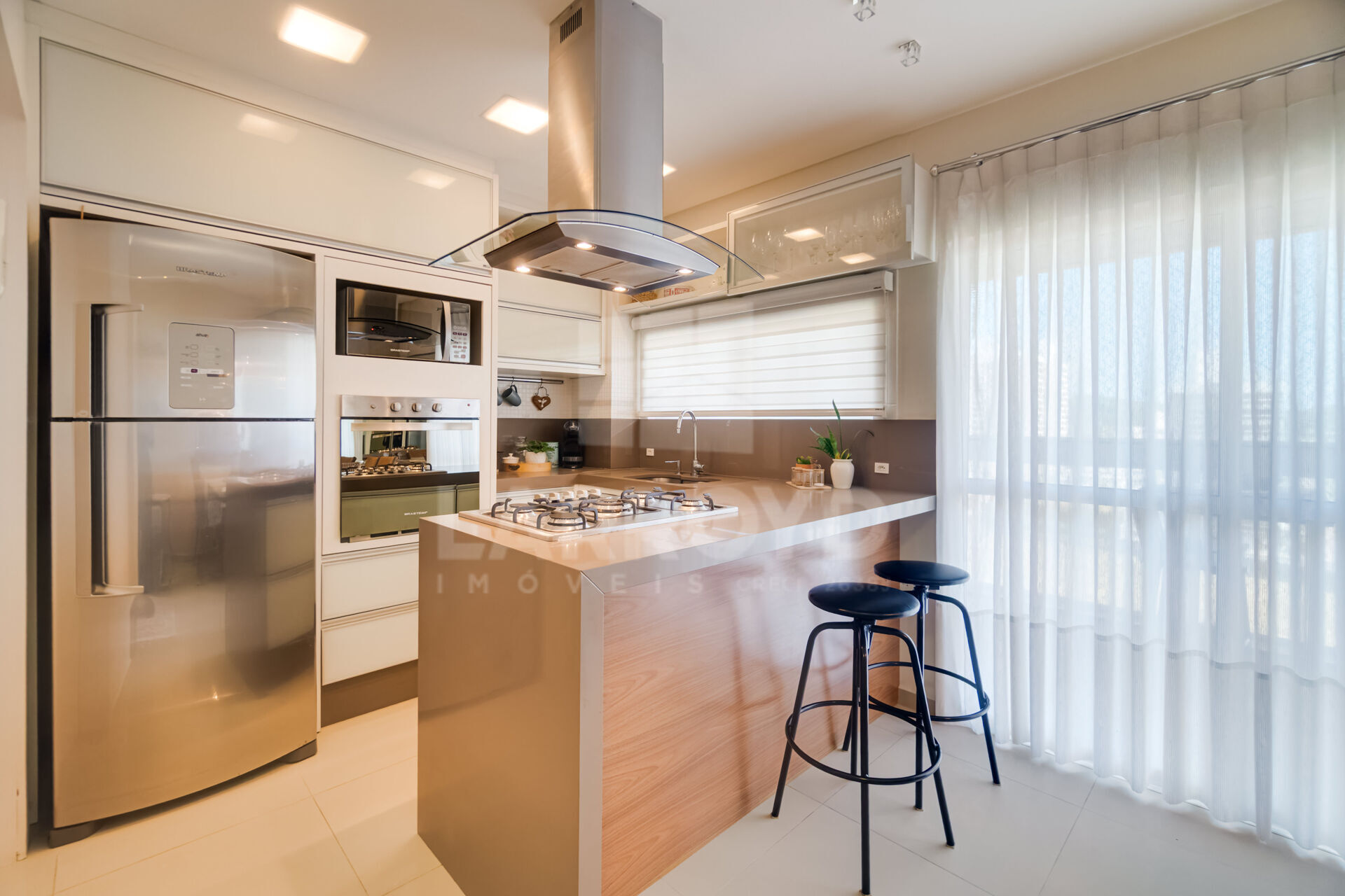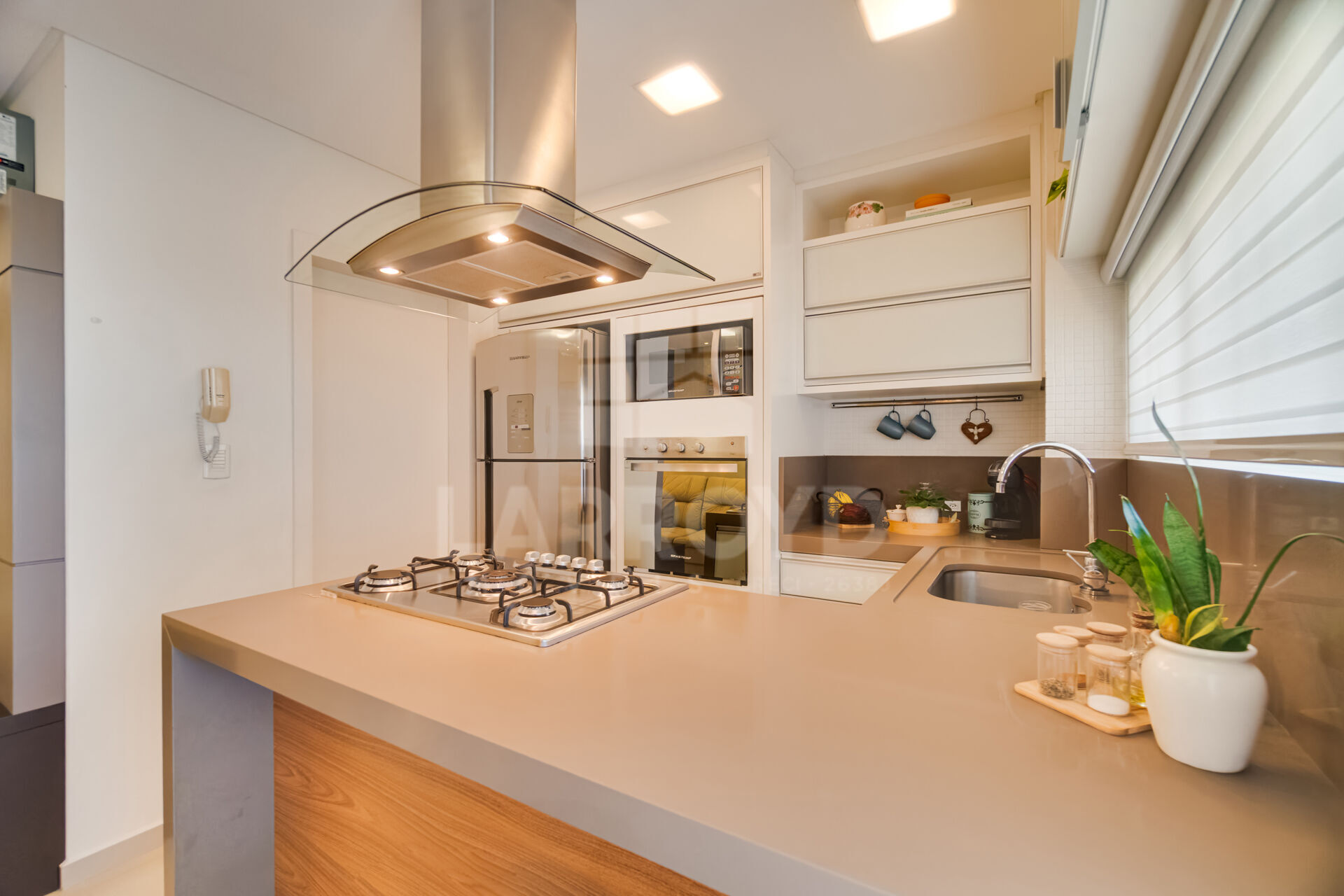 No Residencial Ilhas Maldivas, este apartamento semimobiliado valoriza a rotina com uma cozinha em ilha, coifa em destaque e marcenaria planejada, pronta para o dia a dia sem improviso.