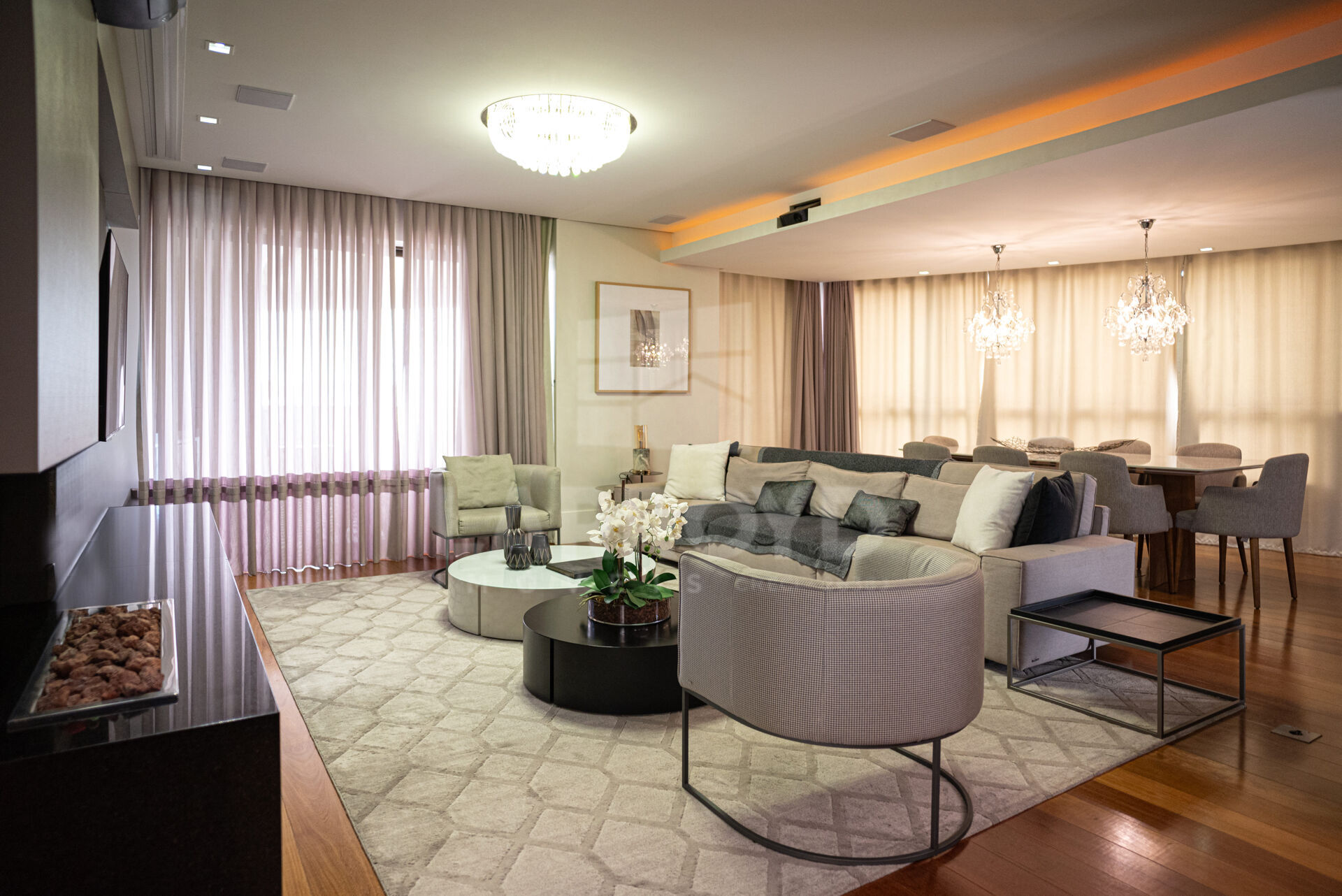 Para uma família que gosta de receber, a sacada com vista livre vira o ponto de encontro para um café no fim da tarde, enquanto sala e jantar funcionam em sequência, com lustres marcantes e acabamentos bem resolvidos. É um imóvel pensado para morar com praticidade e presença, em uma das regiões mais valorizadas da cidade.