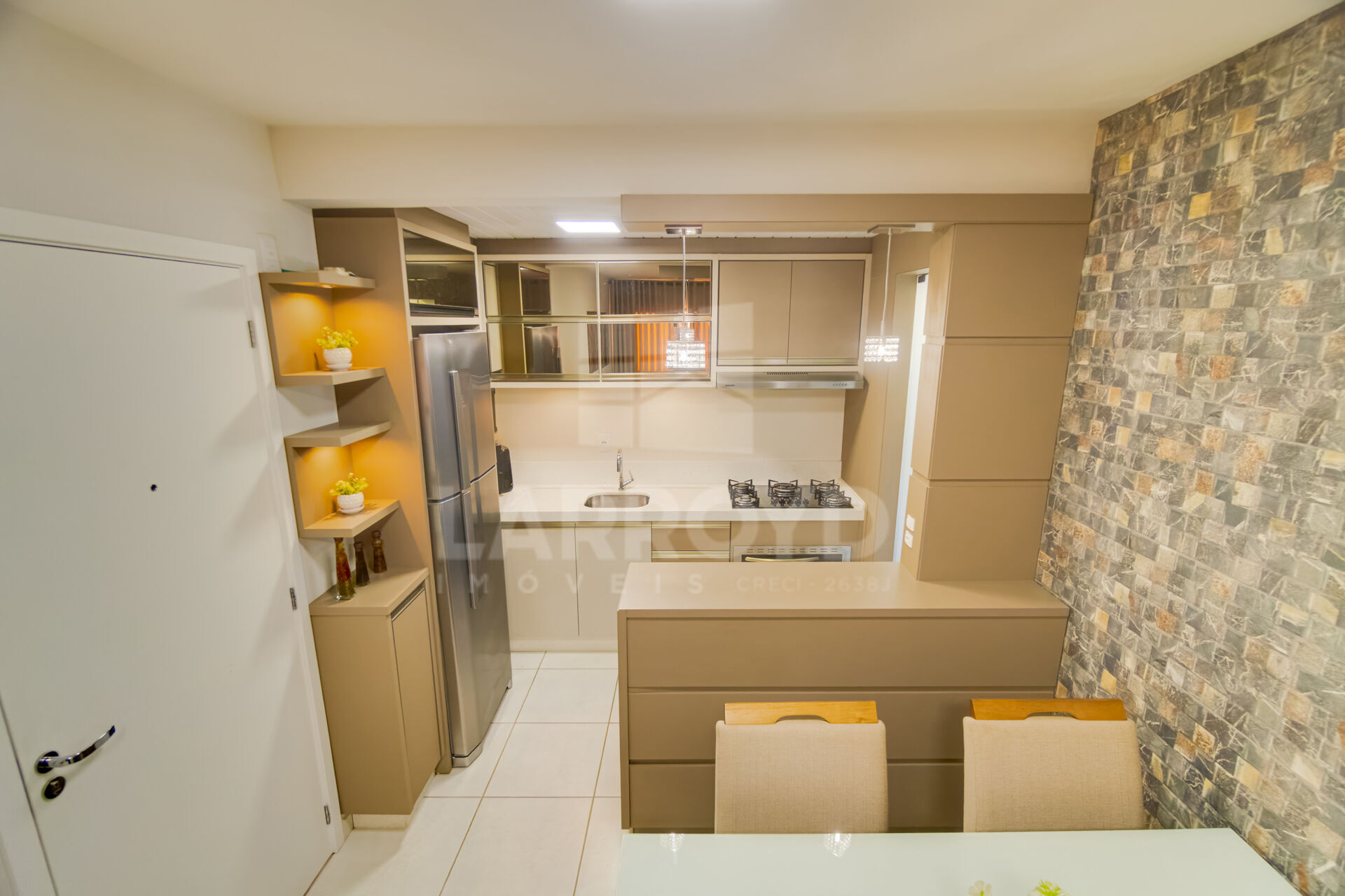 A cozinha conta com móveis planejados e eletros, facilitando o dia a dia e mantendo tudo ao alcance. A área íntima oferece 2 dormitórios bem distribuídos, atendidos por 1 banheiro social, garantindo conforto tanto para uma família quanto para um casal que busca praticidade. Há ainda 1 vaga de garagem vinculada ao imóvel.