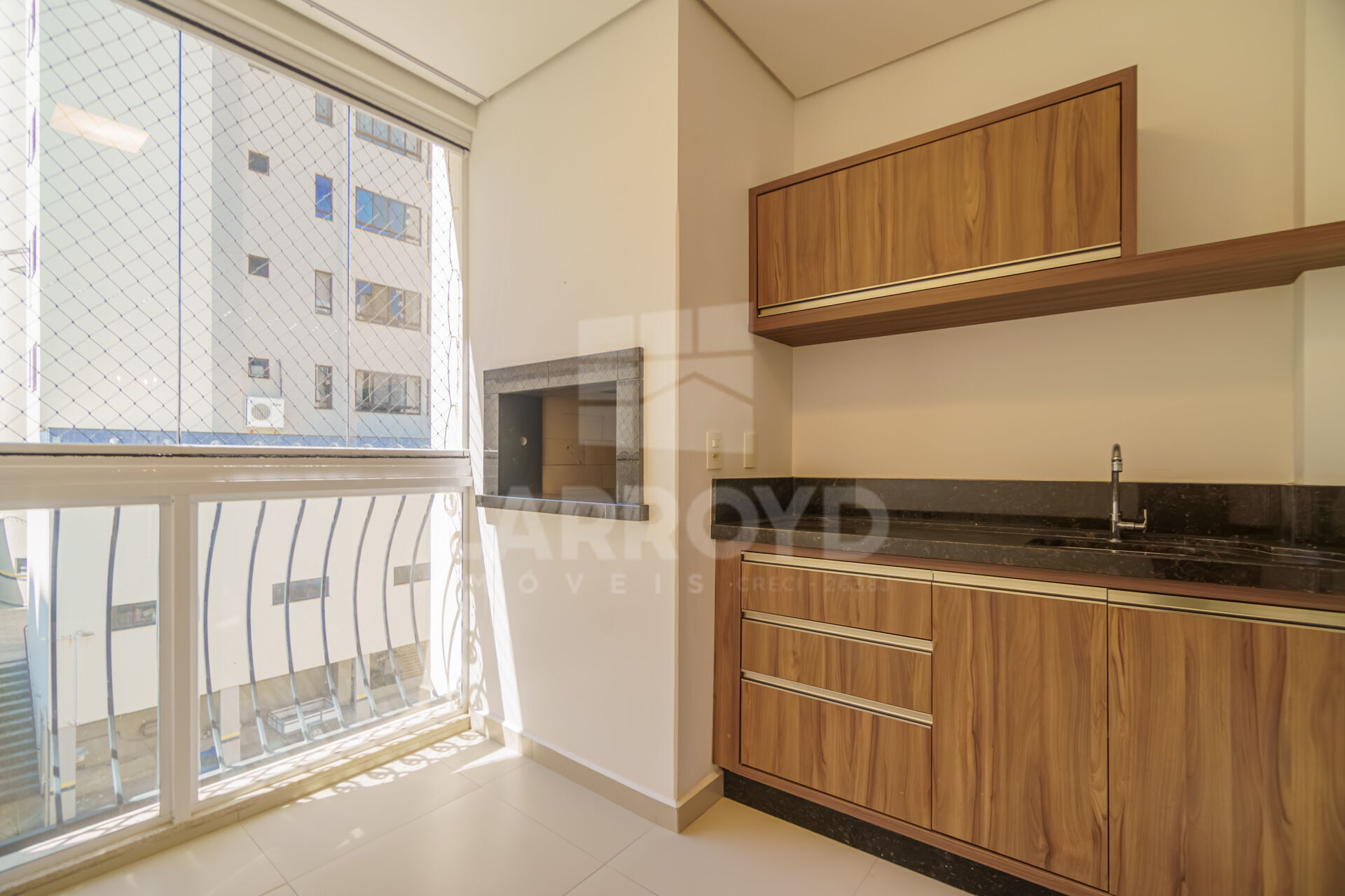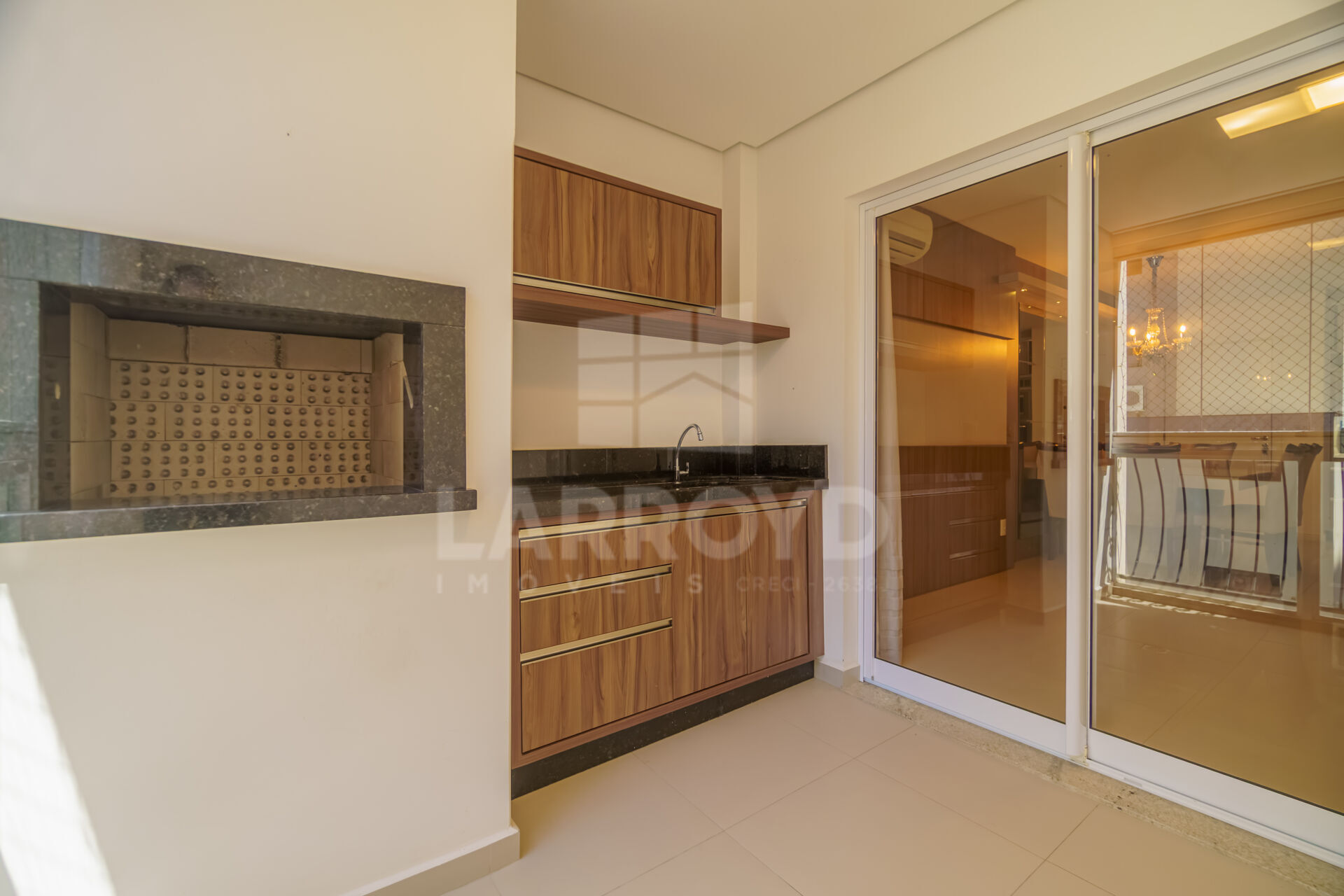 Para uma família que gosta de receber, a sacada gourmet vira o ponto forte: churrasqueira com acabamento em pedra, bancada com cuba e armários em amadeirado, além de portas de correr que conectam o interior com leveza e deixam a luz trabalhar a favor do dia.