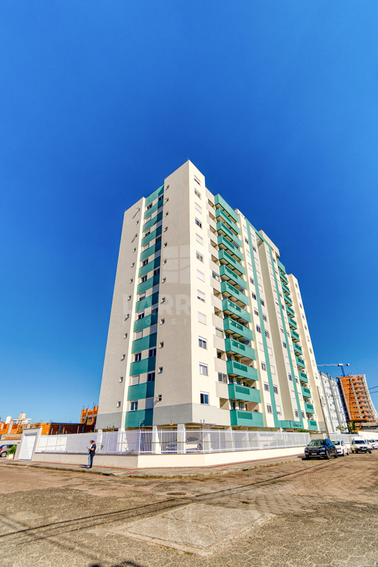 No Residencial Portissol, este apartamento fica no bairro Vila Moema, na Rua Sandra Aguiar Firmino, em uma torre de esquina com sacadas marcantes e fachada clara com detalhes em verde.