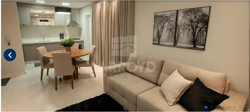 No bairro Centro, este apartamento mobiliado no Monet Smart Home tem sala e cozinha integradas, com mesa redonda já posicionada e cortinas que deixam o ambiente pronto para a rotina. O sofá e a paleta neutra facilitam montar a casa sem esforço, com circulação confortável.