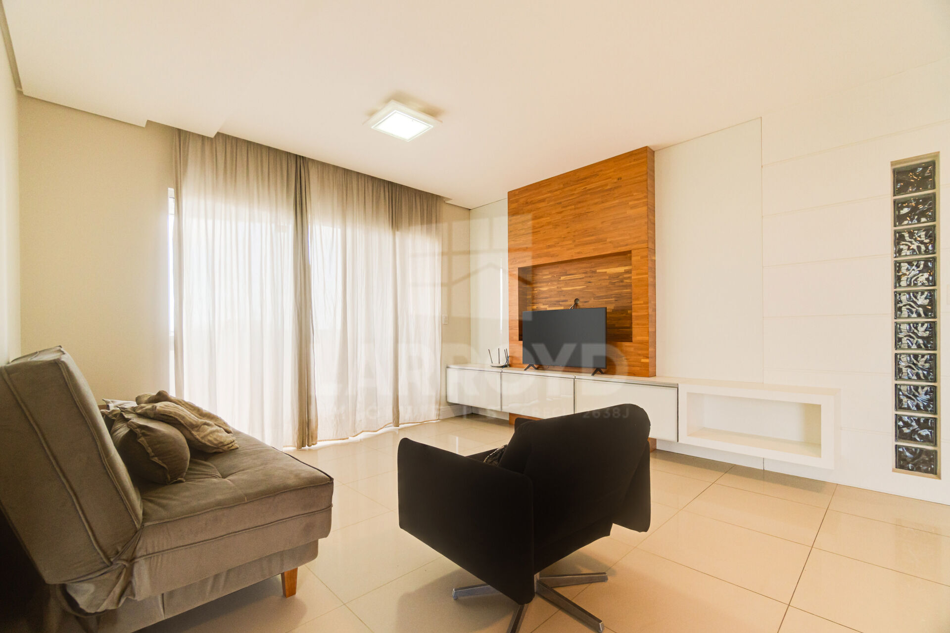 No bairro Vila Moema, este apartamento semimobiliado no Residencial Monte Olimpo entrega uma sala já pronta para o dia a dia, com painel amadeirado para TV e cortinas do piso ao teto, deixando a luz bem controlada e o ambiente organizado.