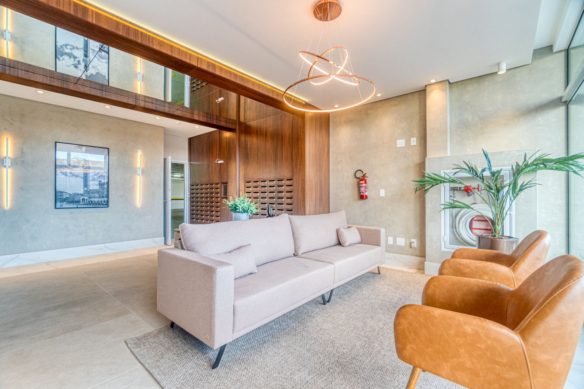 Pelas imagens, o empreendimento tem fachada vertical marcante, acesso com paisagismo e fechamento em vidro na entrada, além de base comercial integrada ao térreo. No condomínio, a presença de geração de energia solar, reaproveitamento de água da chuva e espaços de lazer reforça um uso residencial com manutenção pensada no longo prazo.