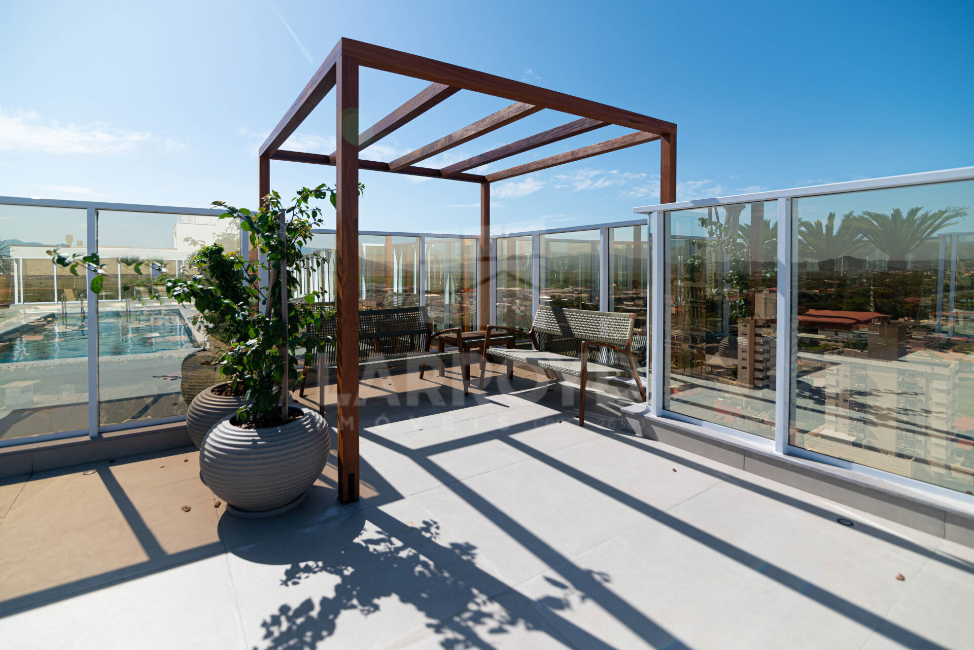O grande diferencial está na área de lazer no topo do prédio, com piscina aquecida, deck com espreguiçadeiras e lounge sob pergolado, tudo com guarda-corpo em vidro e vista aberta para a cidade. E a localização no Aeroporto deixa você perto do Farol Shopping e de serviços essenciais do dia a dia.