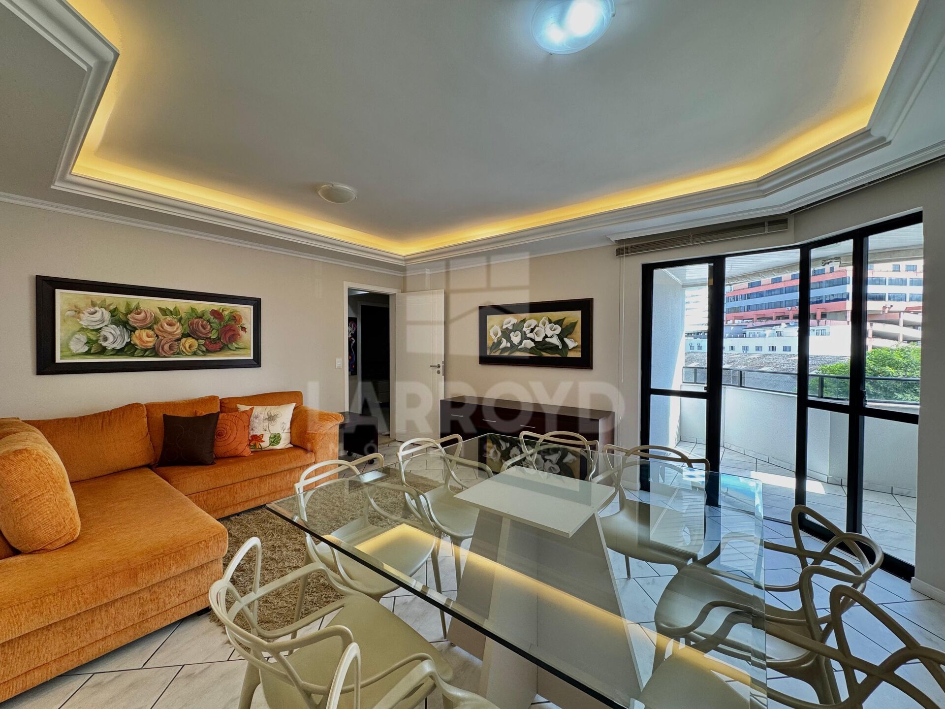 Este apartamento mobiliado e pronto para morar entrega uma área social bem resolvida, com sala integrada à sacada e esquadrias amplas que favorecem a entrada de luz. O teto com acabamento em gesso e iluminação indireta reforça a sensação de cuidado nos ambientes.