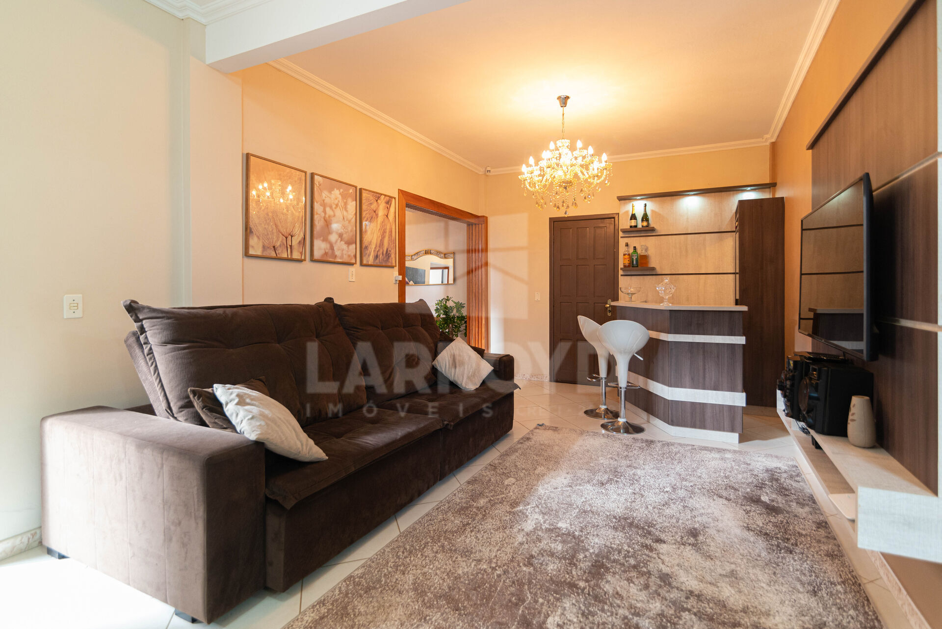 Ficam os móveis sob medida na cozinha e painel da sala.