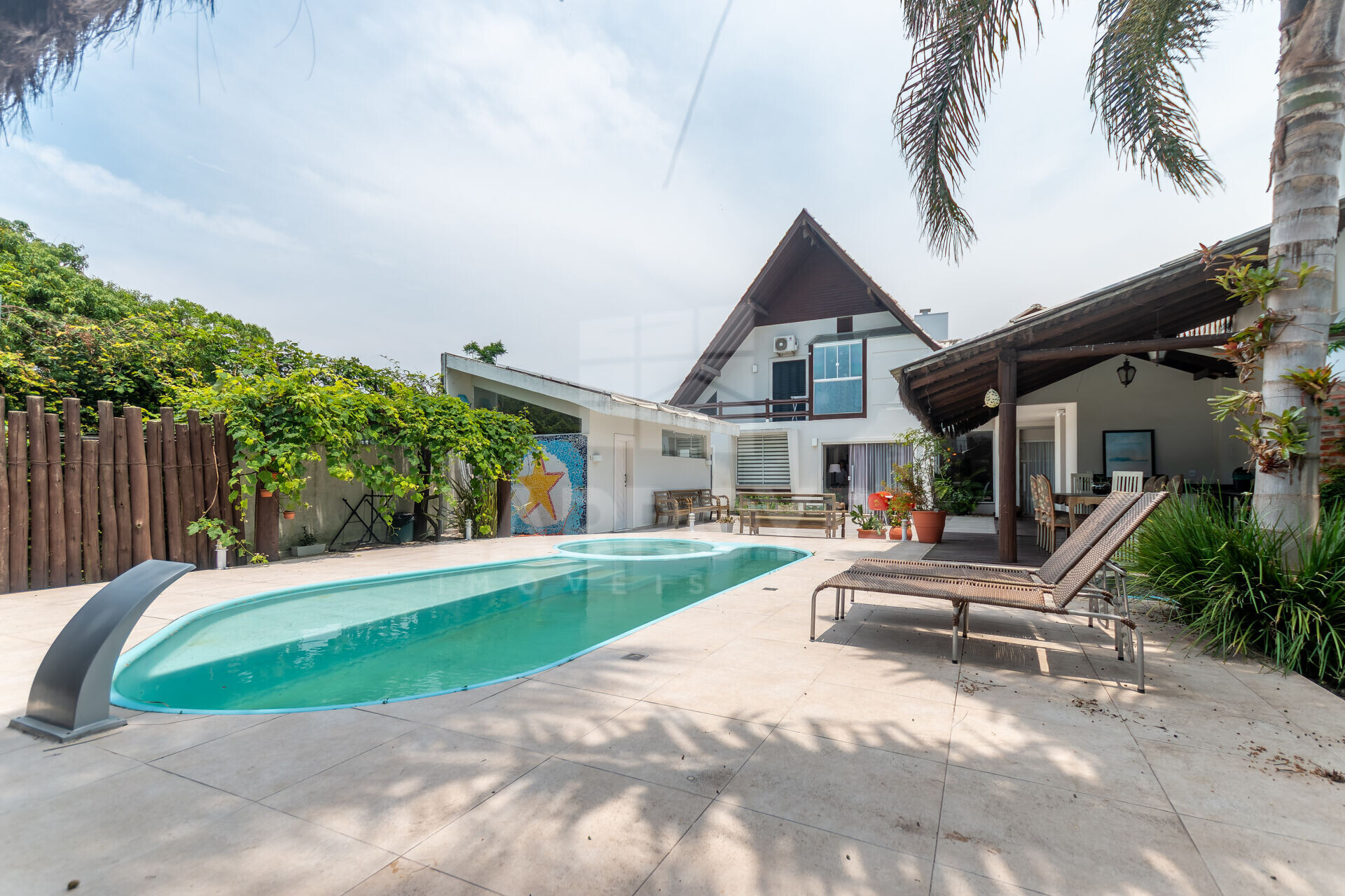 Casa SEMIMOBILIADA, contendo 3 ambientes de sala, espaço gourmet e piscina.