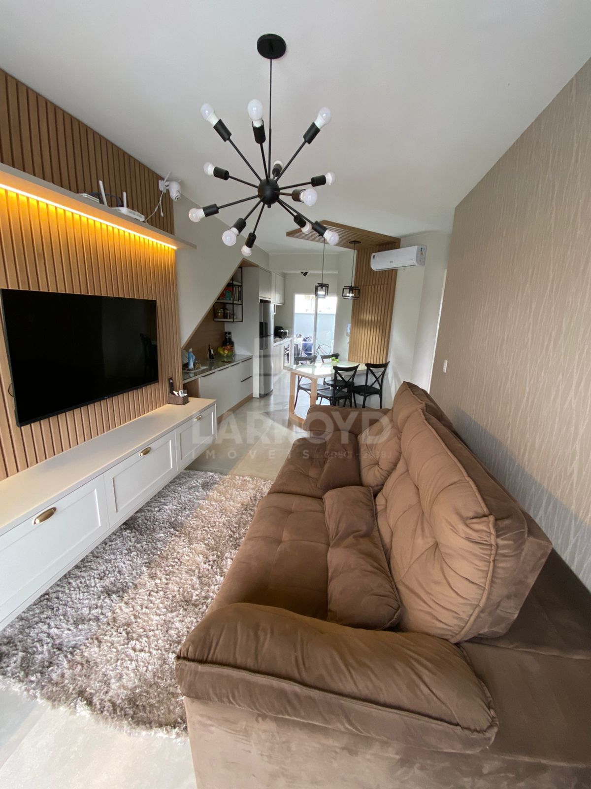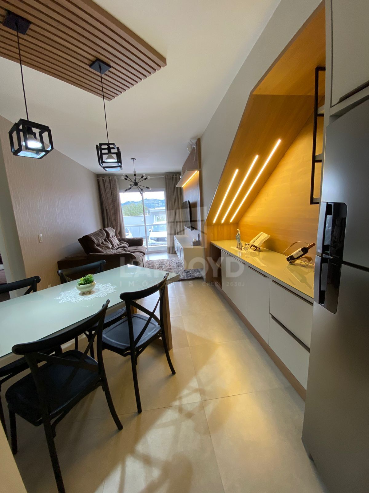Casa em condomínio, contendo 2 dormitórios, banheiro, sala de estar/jantar e cozinha integradas, área de serviço e garagem.