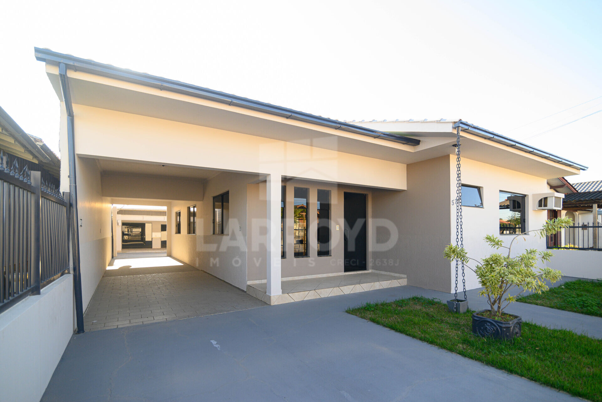 Na fachada, o acesso lateral coberto para veículos e o recuo com gramado frontal deixam a chegada prática e organizada no dia a dia. Por dentro, os ambientes com piso cerâmico e janelas amplas favorecem uma rotina leve para quem quer morar e também trabalhar em casa.