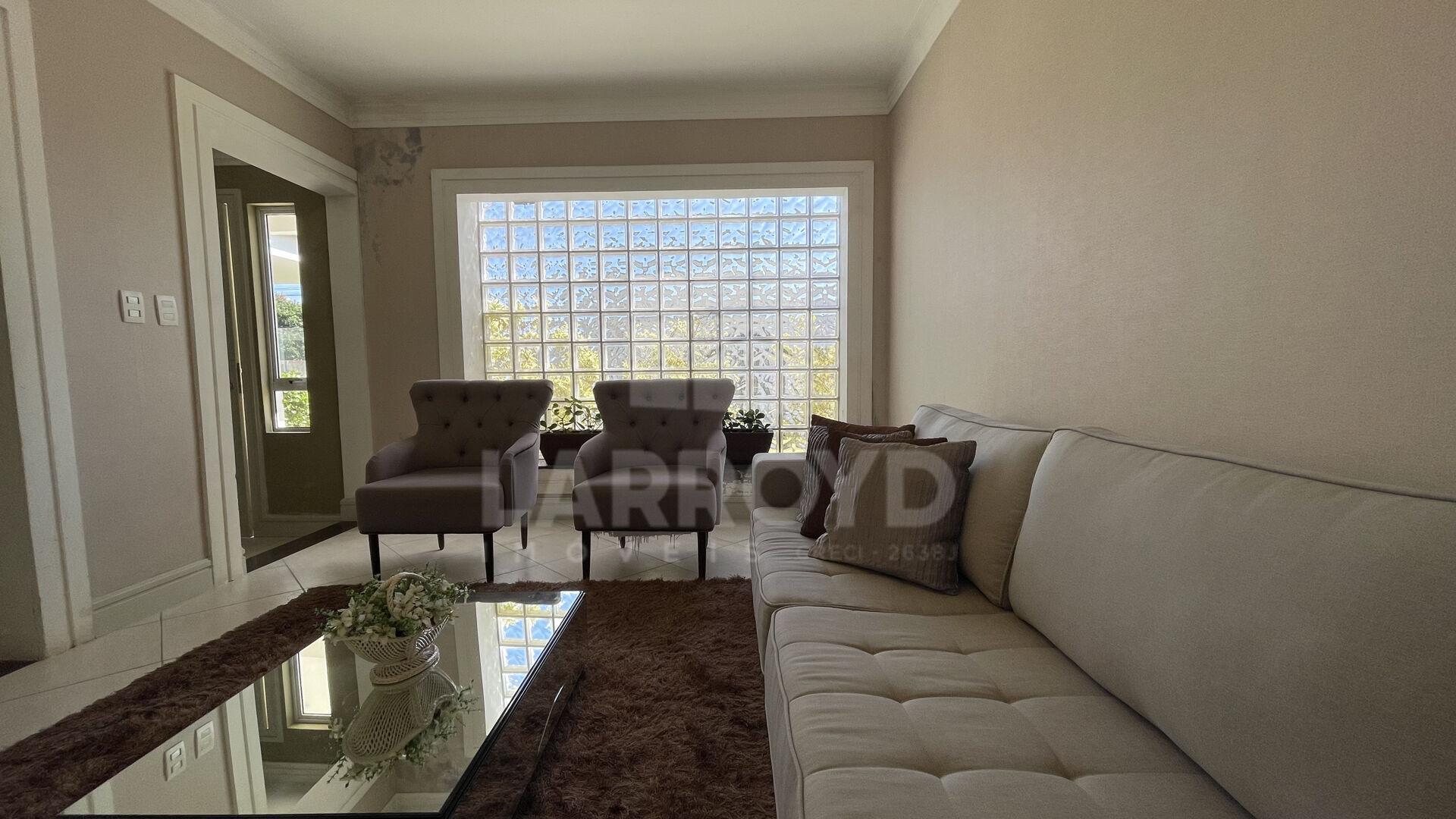 Casa de alvenaria semimobiliada, com sala bem montada e parede de blocos de vidro que traz luz natural e um visual marcante ao ambiente social. Móveis sob medida permanecem, ajudando na organização desde a mudança.