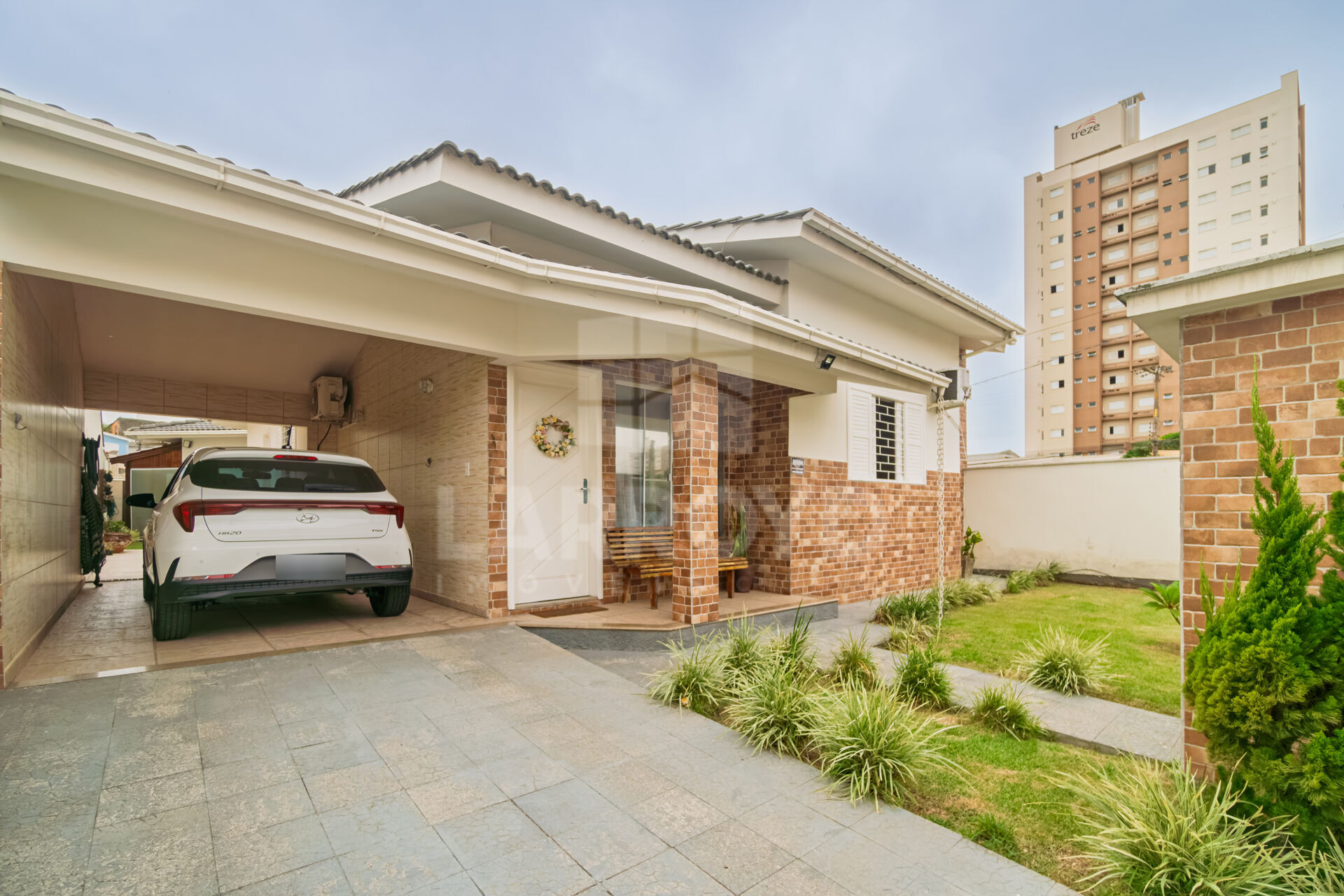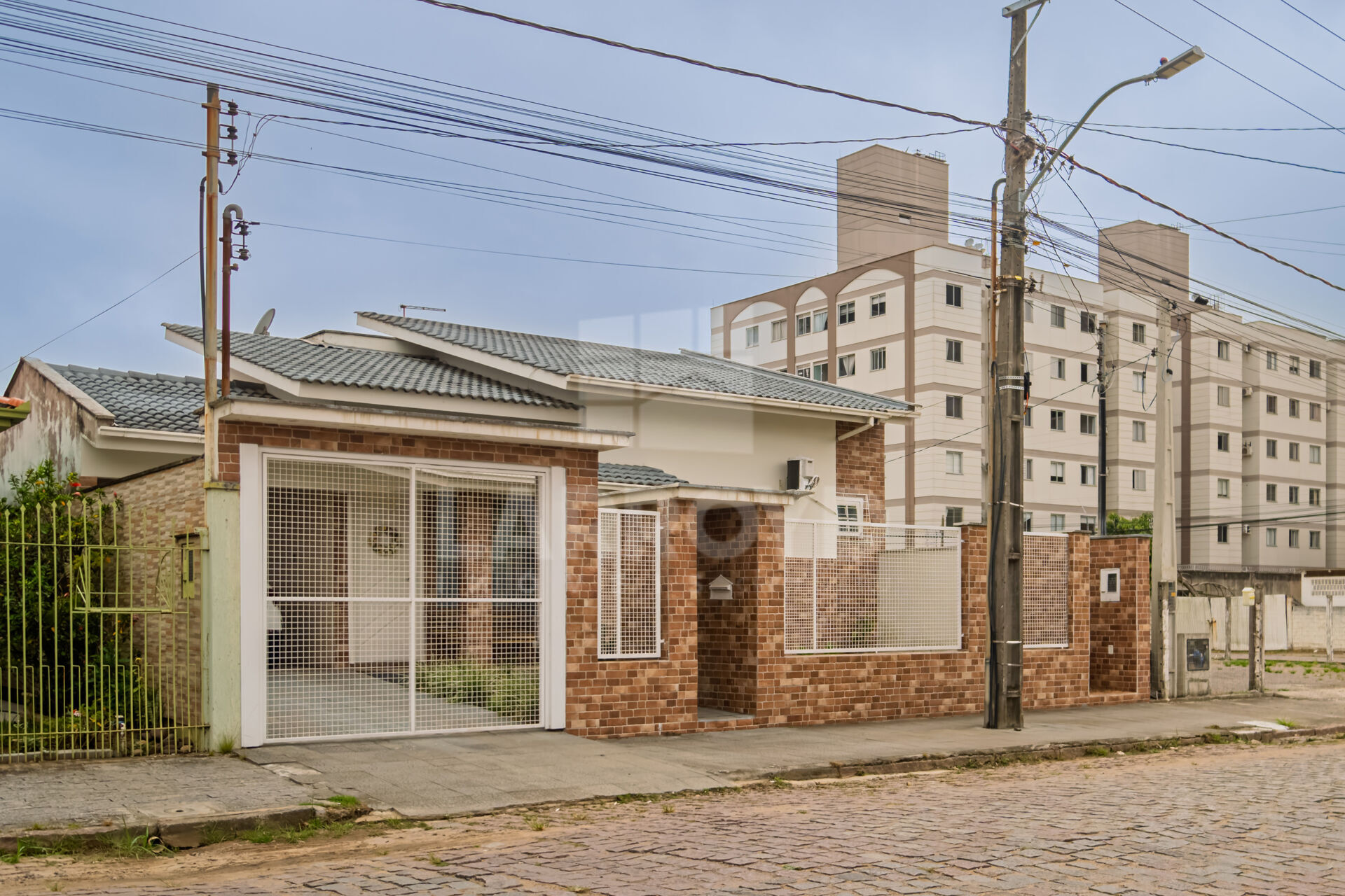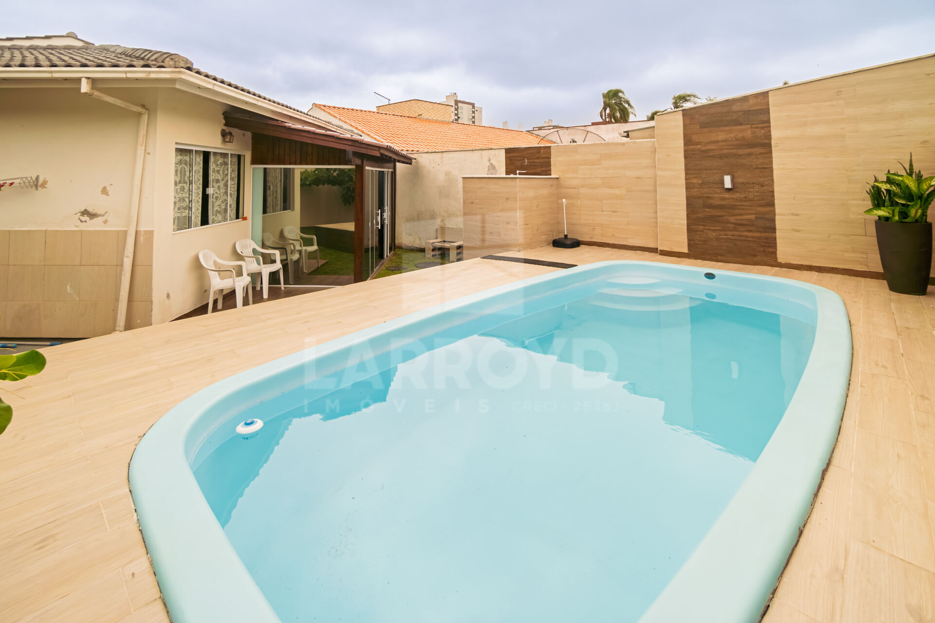 Esta casa no Centro de Tubarão reúne área externa com piscina, pátio revestido e espaço coberto integrado ao lazer, criando um ambiente prático para a rotina de uma família que valoriza convivência em casa. A fachada murada, com jardim frontal e acabamento em tijolo aparente, reforça uma presença bem definida desde a chegada.