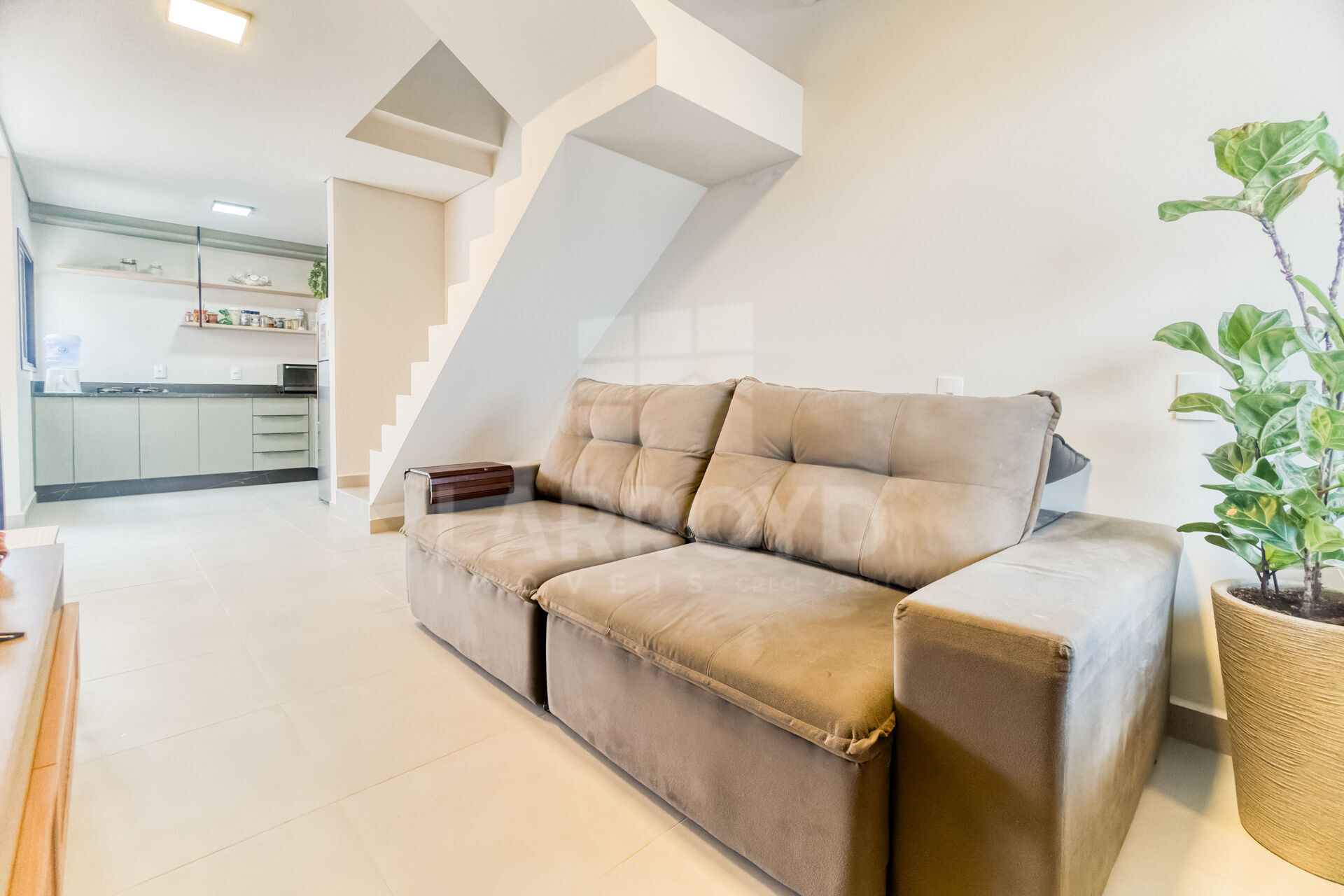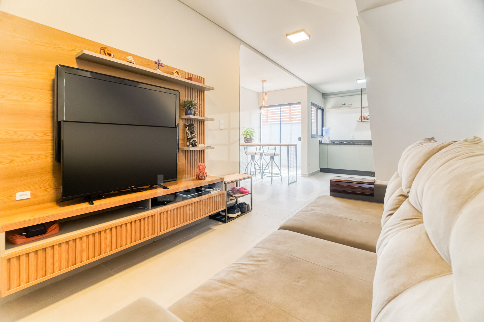 No Residencial Palmas, esta casa em condomínio traz uma área social integrada, com piso claro e marcenaria em madeira no painel de TV, criando um ambiente pronto para a rotina. A escada interna bem posicionada ajuda a separar convivência e privacidade no dia a dia.