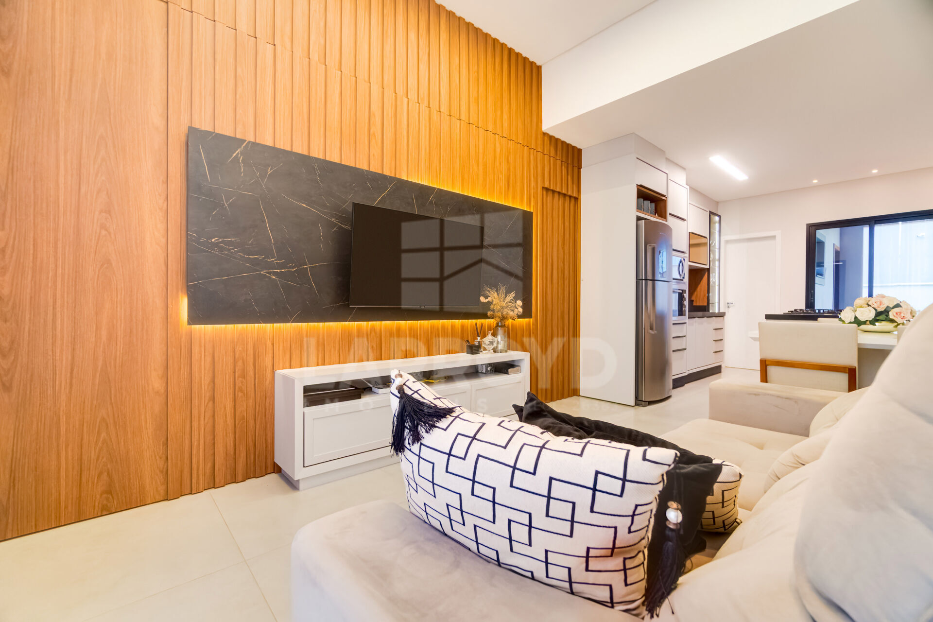 Casa semimobiliada no Viamar Parque Residencial, com sala integrada à cozinha e circulação bem resolvida para a rotina. O living tem painel ripado com iluminação embutida e rack, criando um ambiente pronto para receber e relaxar.