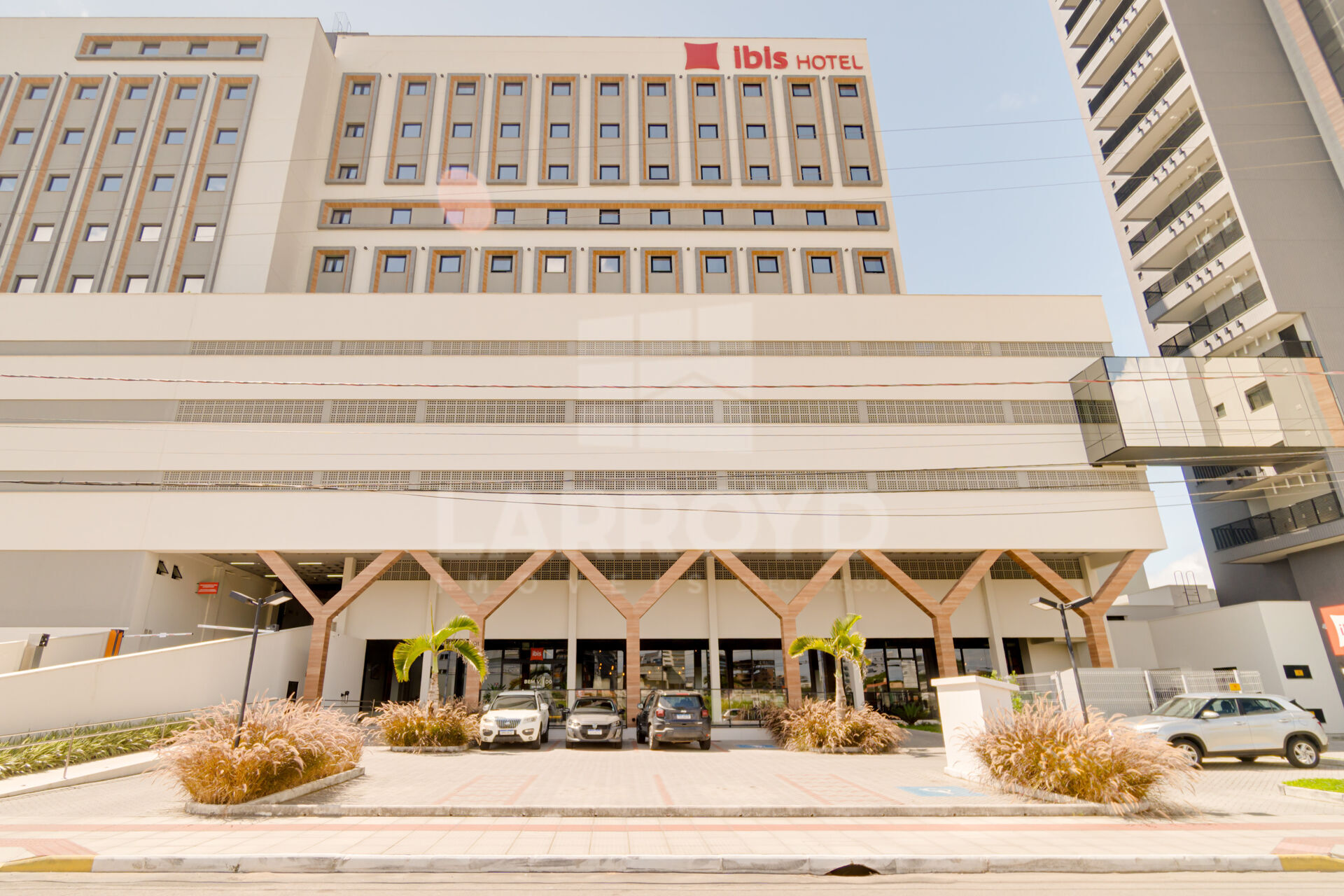 A fachada com a identificação Ibis Hotel e a implantação na Avenida Marcolino Martins Cabral reforçam a presença e o fluxo da região, com fácil acesso e entorno consolidado. Nas proximidades, destaque para o Farol Shopping, além de serviços do dia a dia.