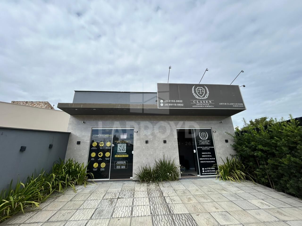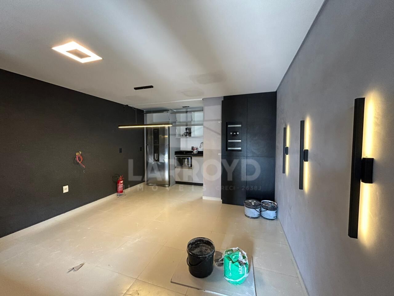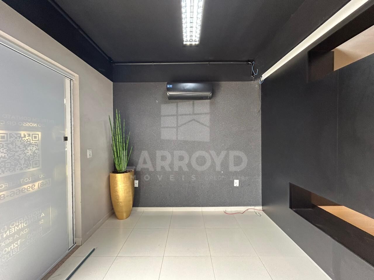 Por dentro, o acabamento em tons escuros, a iluminação embutida e os nichos na parede ajudam a organizar atendimento, exposição de produtos ou estação de trabalho. Há ainda um espaço de apoio com bancada e armários, prático para a rotina de escritório ou prestação de serviços.