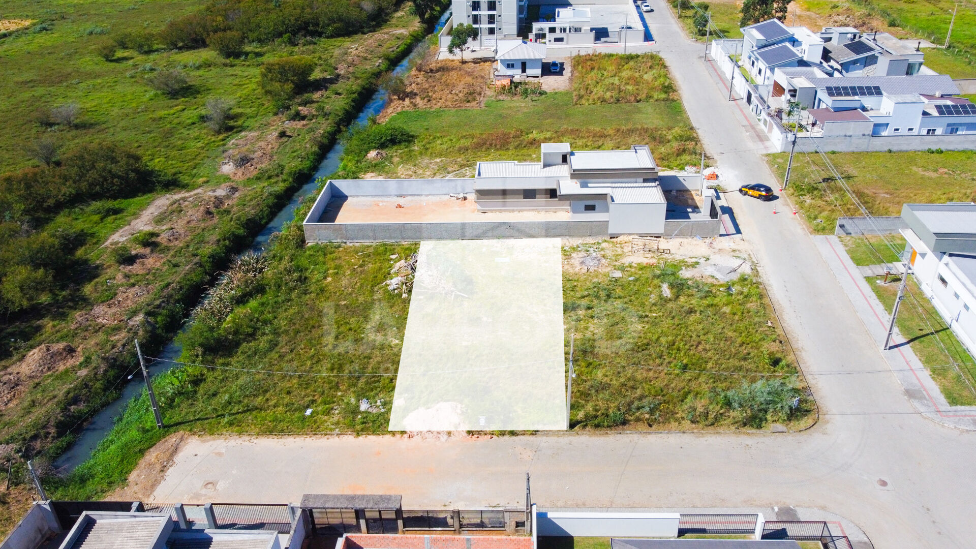 Nas imagens, o lote aparece com frente para rua pavimentada e com uma faixa verde ao lado, trazendo mais respiro para o entorno. O loteamento já conta com ruas em paver, arborização nos passeios e praça com playground, além de redes de água, energia, iluminação pública e esgoto.