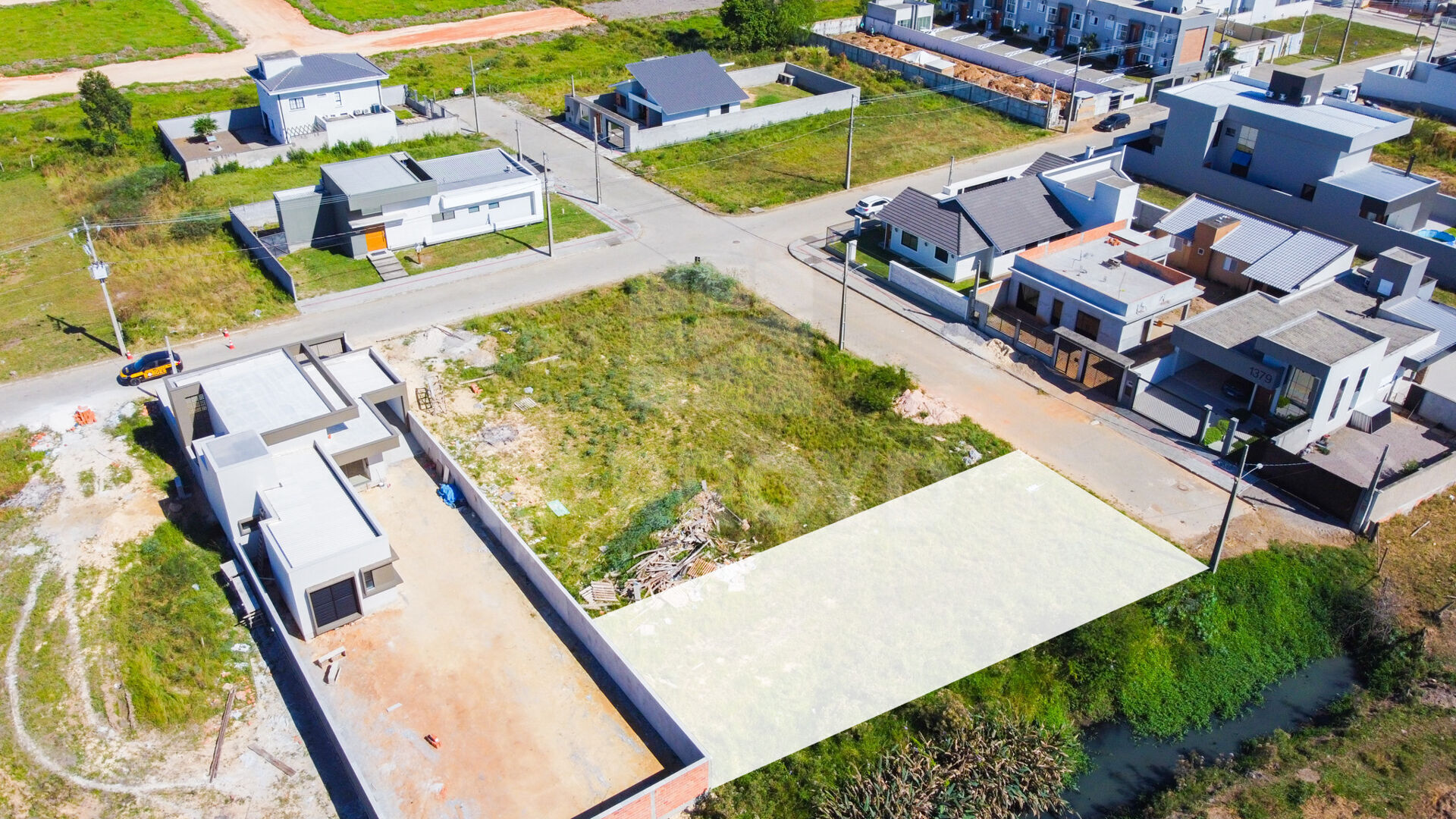 O loteamento já entrega ruas em paver e infraestrutura completa (água, energia, iluminação e rede coletora de esgoto), além de praça arborizada com playground, trazendo um ponto real de encontro para o dia a dia.