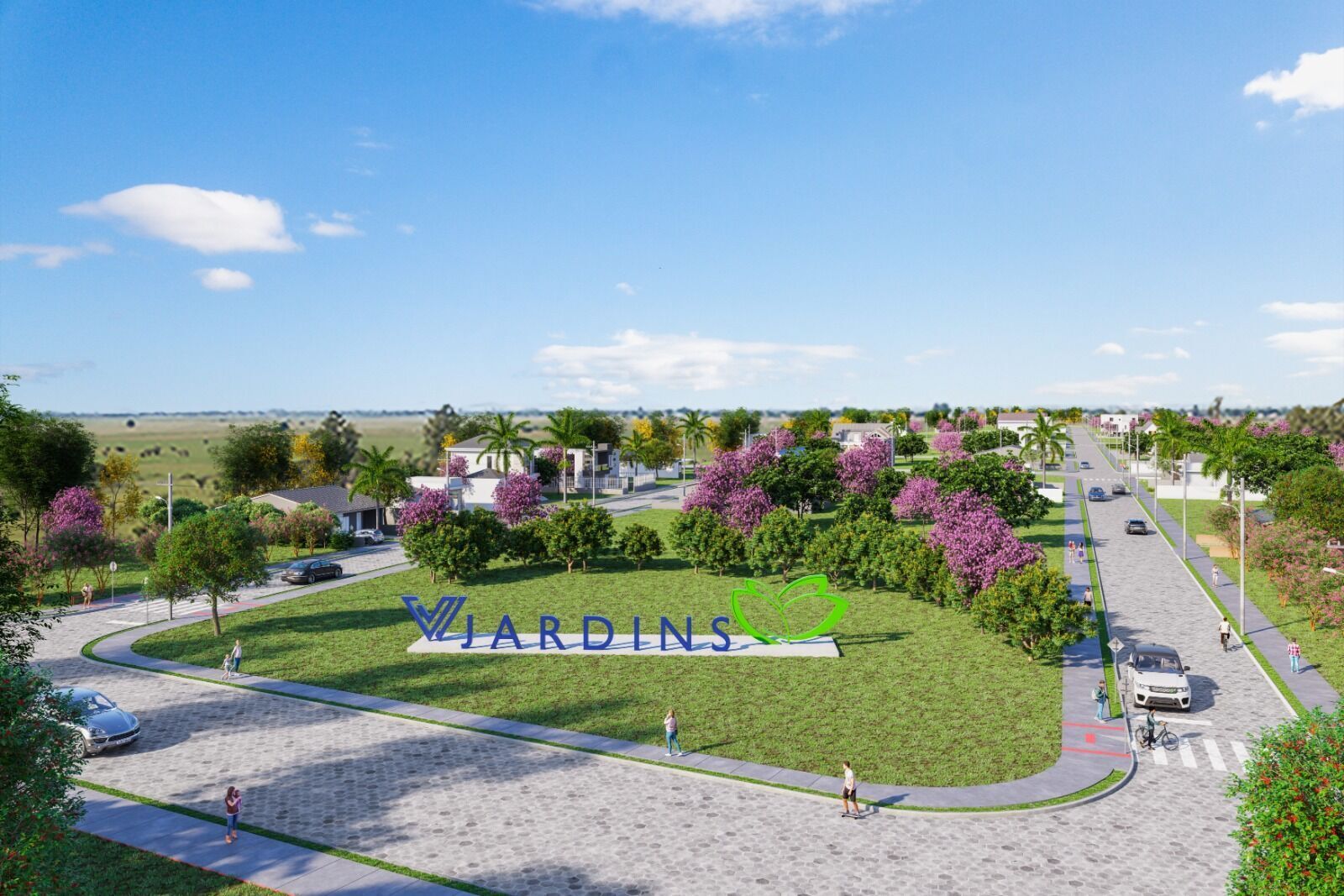 Terreno no Loteamento Jardins, no bairro São Clemente, em um traçado planejado e com área de convivência destacada logo na entrada. As imagens do empreendimento mostram a praça gramada com o letreiro “Jardins” e ruas internas com pavimentação em blocos.