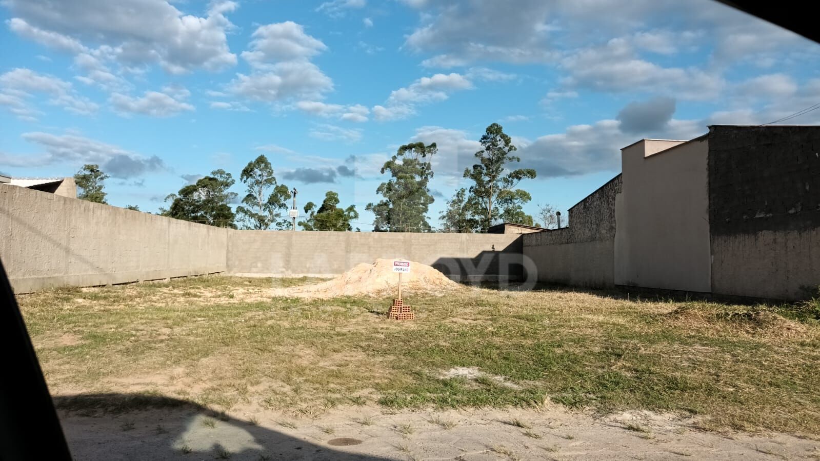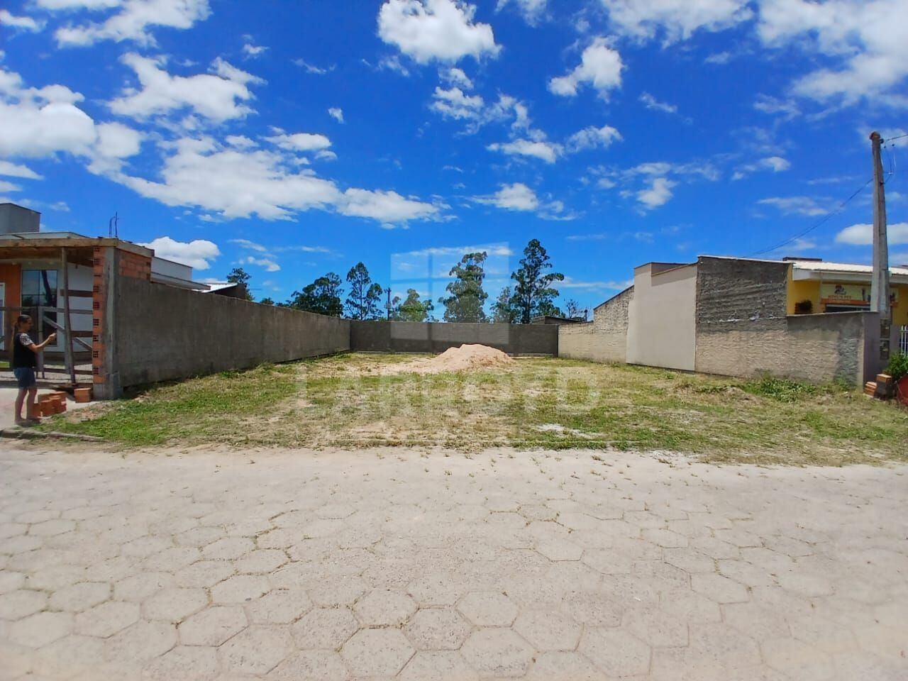 Terreno no Loteamento Santa Helena, em rua com pavimentação em blocos, com muros nas laterais e nos fundos, trazendo mais privacidade para o projeto. As fotos mostram o lote já limpo, com boa profundidade e vizinhança consolidada.